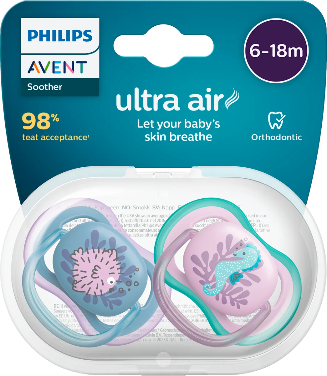 Za bebe od 6 – 18 mjeseci Ne sadrže BPA Ortodontski dizajnirane Philips Avent Ultra Air duda varalica, namijenjena je djeci u dobi od 6 – 18 mjeseci.
