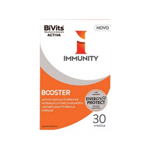 Formulacija koja u jednoj kesici omogućava uravnoteženi sinergistički efekat svih neophodnih vitamina, antioksidanasa, minerala i fitonutrijenata koji pružaju idealnu podšku imunom sistemu odraslih i omogućavaju bolju zaštitu organizma i više energije. BiVits® ACTIVA Immunity Booster je komforan za primjenu, prijatnog ukusa limuna gdje svaki gutljaj omogućava dnevno preporučene doze mikronutijenta u kompleksnom sastavu – 12 vitamina, 9 minerala i 3 fitonutrijenta. Da bi zadovoljili posebno povećane potrebe za mikronutrijentima, preporučujemo da se BiVits® ACTIVA Immunity Booster uzima dugoročno.